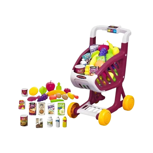 عربة تسوق لعب للأطفال مع 41 قطعة ملونة تحاكي تجربة التسوّق الحقيقية. مصنوعة من بلاستيك آمن بخيارات ألوان جذابة، تساعد على تطوير المهارات الحركية والخيال. مثالية كهديّة للأطفال من 2–5 سنوات.