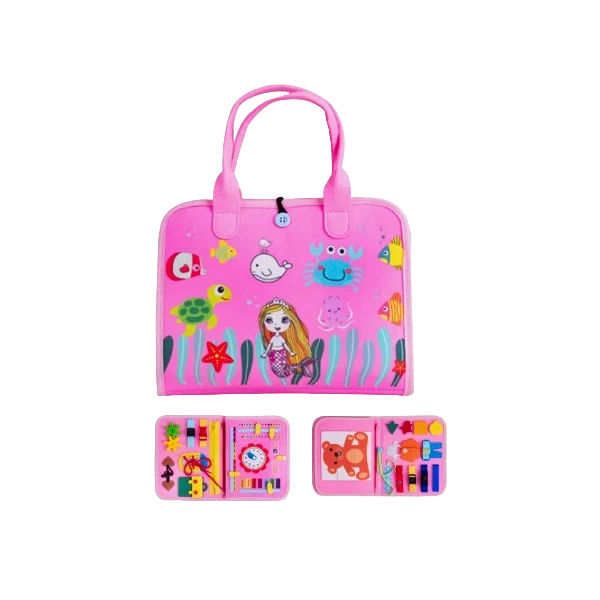 تصميم 2 في 1: تعمل كحقيبة يد أنيقة برسومات "حورية البحر" وعالم البحار، وتتحول عند فتحها إلى لوحة أنشطة متكاملة.