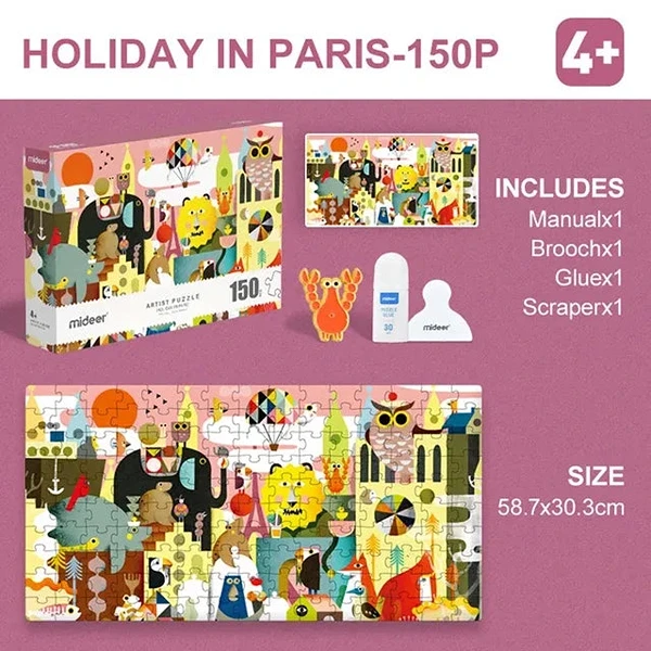 تحتوي اللعبة على 150 قطعة ملونة تعرض مشاهد ساحرة من باريس، مما يجعلها تجربة بصرية ممتعة للأطفال.