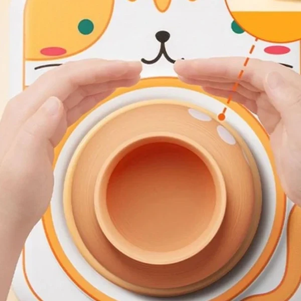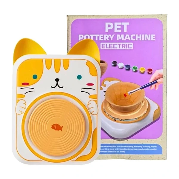 آلة فخار كهربائية: تحتوي اللعبة على آلة فخار كهربائية سهلة الاستخدام، مما يجعل عملية تشكيل الفخار ممتعة وآمنة. تصميمها الجذاب على شكل قطة يضيف لمسة من المرح.