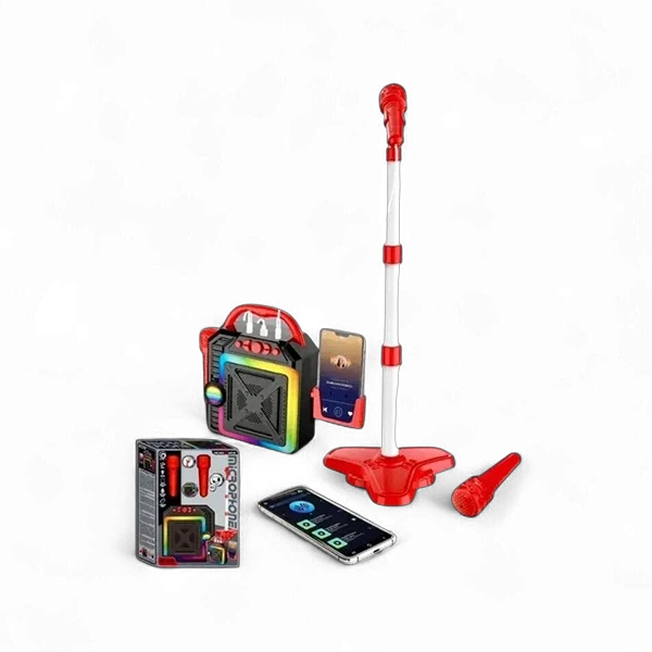نظام ترفيهي منزلي متكامل للأطفال، مصمم لمنحهم تجربة المسرح والاحتراف الغنائي. يجمع بين الميكروفون اللاسلكي، مكبر صوت متطور، وحامل قابل للتعديل مع إضاءات ملونة.