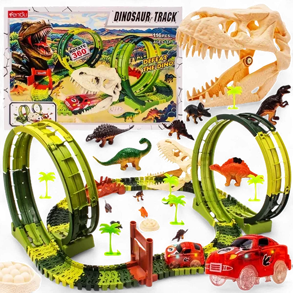 - محتوى المجموعة (116 قطعة): تتضمن مسارات مرنة بألوان الغابة، نفقاً ضخماً على شكل جمجمة ديناصور، جسوراً، وأشجاراً لتشكيل بيئة متكاملة.