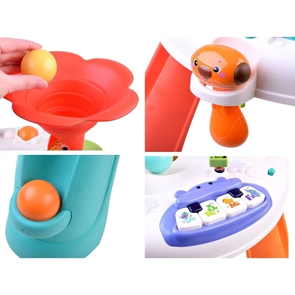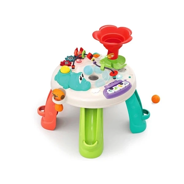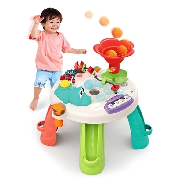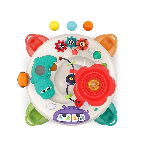 تعد لعبة "طاولة اللعب المتنوعة" مثالية لتطوير مهارات الأطفال الحركية والمعرفية. تحتوي الطاولة على مجموعة متنوعة من الأنشطة التي تشمل الرمي، التكديس، والأصوات الممتعة، مما يجعلها تجربة شاملة من التفاعل والتعلم.
