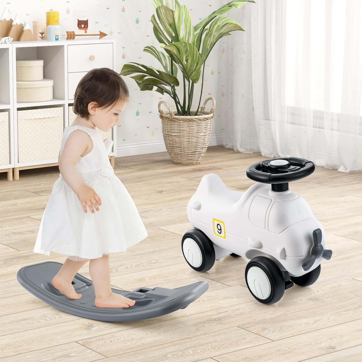 أزرار تفاعلية: تحتوي اللعبة على عجلة قيادة دوارة، مما يضيف عنصر المتعة ويعزز من خيال الأطفال أثناء اللعب.