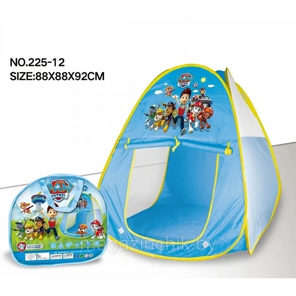 - تصميم مبهج: تأتي الخيمة بتصميم زاهي باللون الأزرق، مزينة بشخصيات "باو باترول" الشهيرة مثل رايدر وأصدقائه، مما يجعلها جذابة للأطفال.