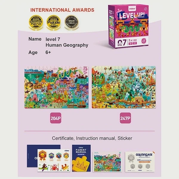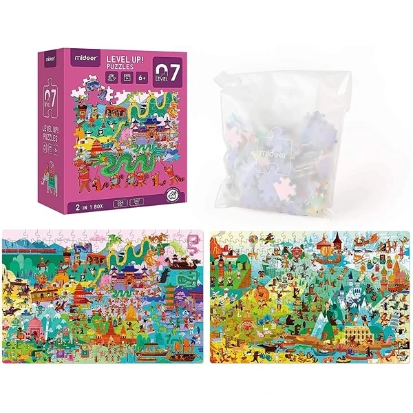 - المحتويات: تتضمن مجموعتين من الألغاز، واحدة تحتوي على 204 قطعة والأخرى على 247 قطعة، مما يتيح للأطفال الاستمتاع بتجربة غنية وممتعة.