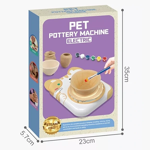 آلة فخار كهربائية: تحتوي اللعبة على آلة فخار كهربائية سهلة الاستخدام، مما يجعل عملية تشكيل الفخار ممتعة وآمنة. تصميمها الجذاب على شكل قطة يضيف لمسة من المرح.