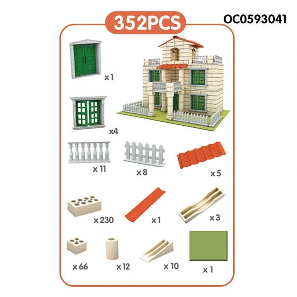 - 352 قطعة ملونة: تحتوي المجموعة على مجموعة متنوعة من القطع الملونة، مما يتيح للأطفال إمكانية بناء فيلا كلاسيكية مع تفاصيل معمارية جذابة.