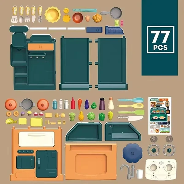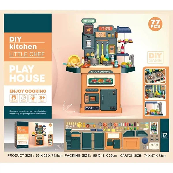 - 77 قطعة متنوعة: تحتوي اللعبة على مجموعة شاملة من الأدوات المطبخية، مما يتيح للأطفال تجربة الطهي كما لو كانوا في مطعم حقيقي.